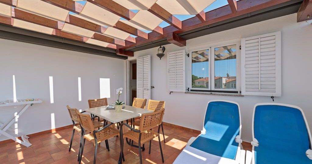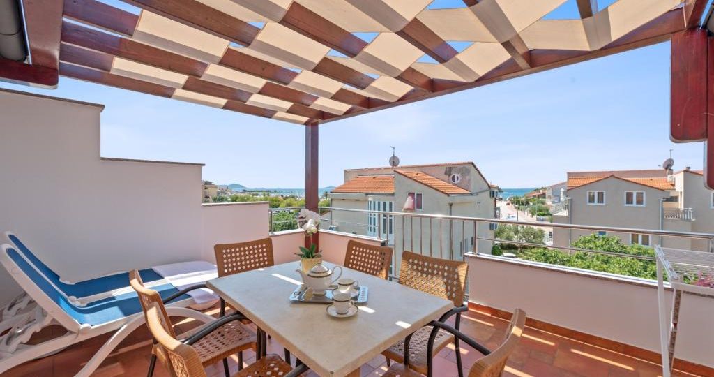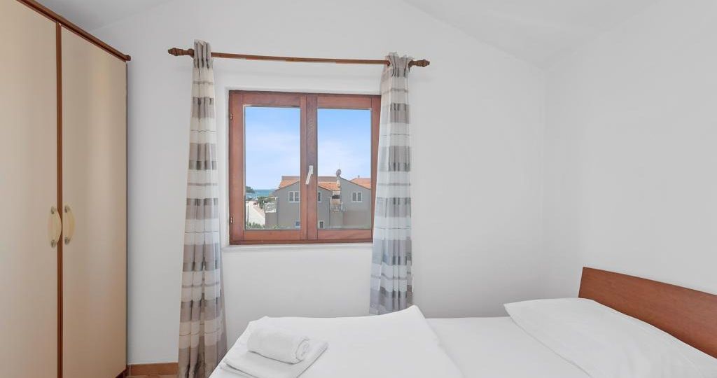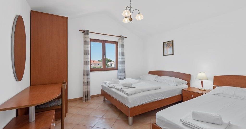 Apartman se nalazi na drugom katu obiteljske kuće. Sastoji se od kuhinje i dnevnog boravka sa trosjedom na razvlačenje, spavaće sobe sa dva kreveta, zasebne kupaonice i balkona. Gostima je na raspolaganju vanjski bazen, zajednička terasa, dvorište, roštilj i vanjski tuš.
